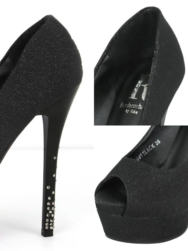 3. ラメ ハイヒールビジュー オープントゥ パンプス (ブラック) (14cmヒール)