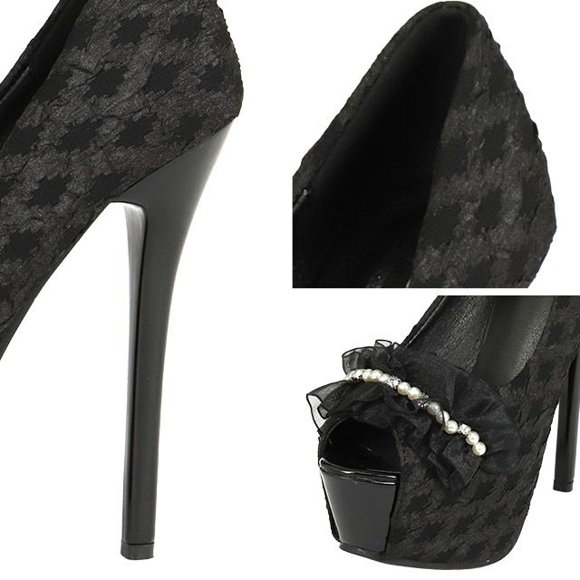4. パールビジューフリルオープントゥワンカラーパンプス (ブラック) (14cmヒール)