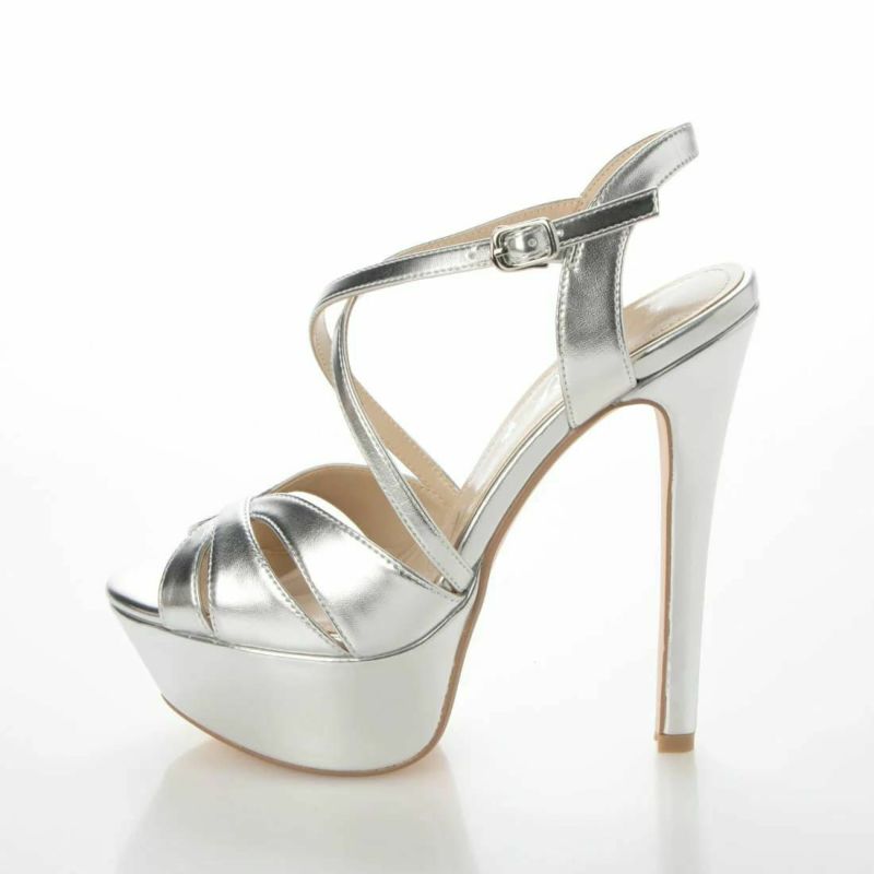 美脚魅せ効果抜群♪ SALE [BlueButterfly/ブルーバタフライ] 高級クロスアンクルストラッププラットフォームハイヒールパンプス (シルバー) (16cmヒール)