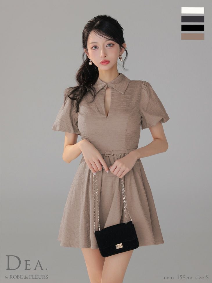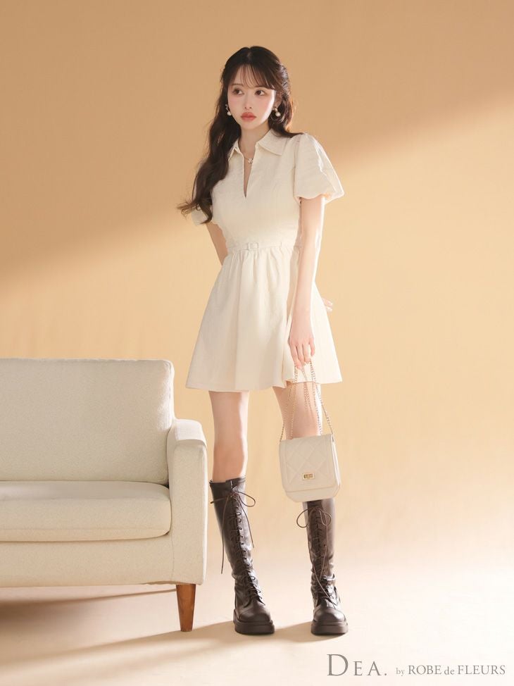 他の画像を見る シンプルながらも上品さ溢れる♡ [DEA.byROBEdeFLEURS/ディアバイローブドフルール] 高級 ブランド Aラインミニドレス 谷間 半袖 ウエストベルト 襟付き ワンカラー ワッフル ¥ 27,280 税込 お気に入りに追加
