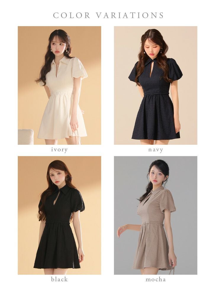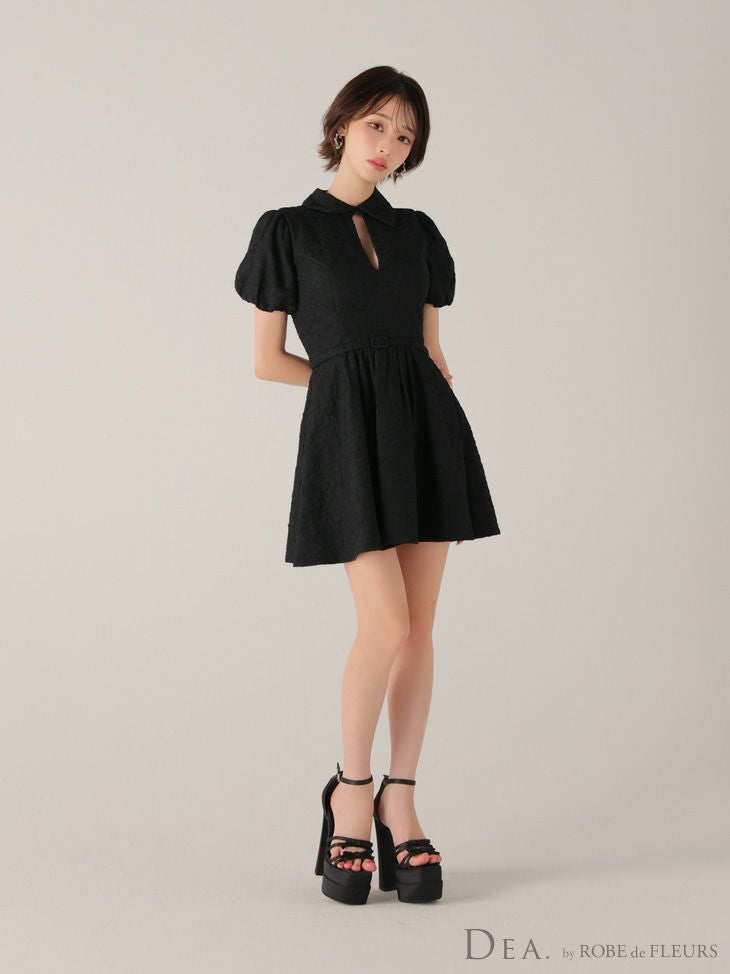 他の画像を見る おしゃれにスタイルアップを狙える♡ 予約商品【4月中旬入荷予定】[ROBEdeFLEURSGlossy/ローブドフルールグロッシー] 高級 ブランド Aラインミニドレス 谷間 半袖 ウエストベルト 襟付き ジップ ¥ 28,380 税込 お気に入りに追加
