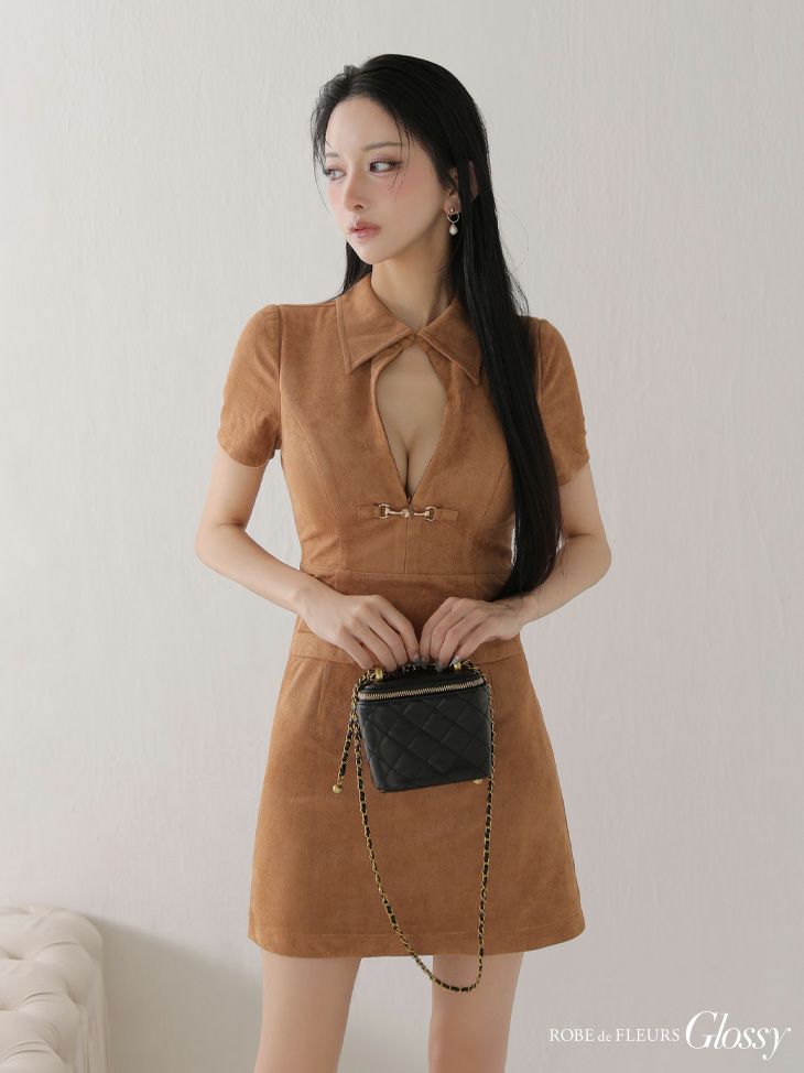 他の画像を見る バストカットで色気を仕込む♡ [ROBEdeFLEURSGlossy/ローブドフルールグロッシー] 高級 ブランド タイトミニドレス 半袖 谷間 襟付き スエード ¥ 27,280 税込 お気に入りに追加