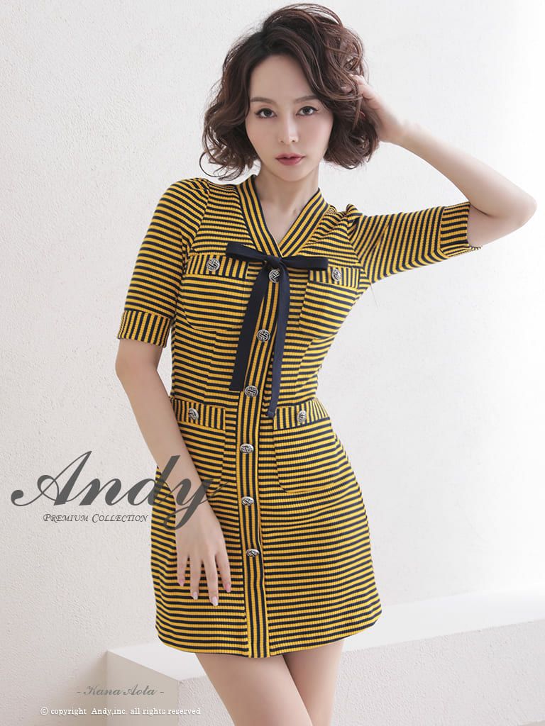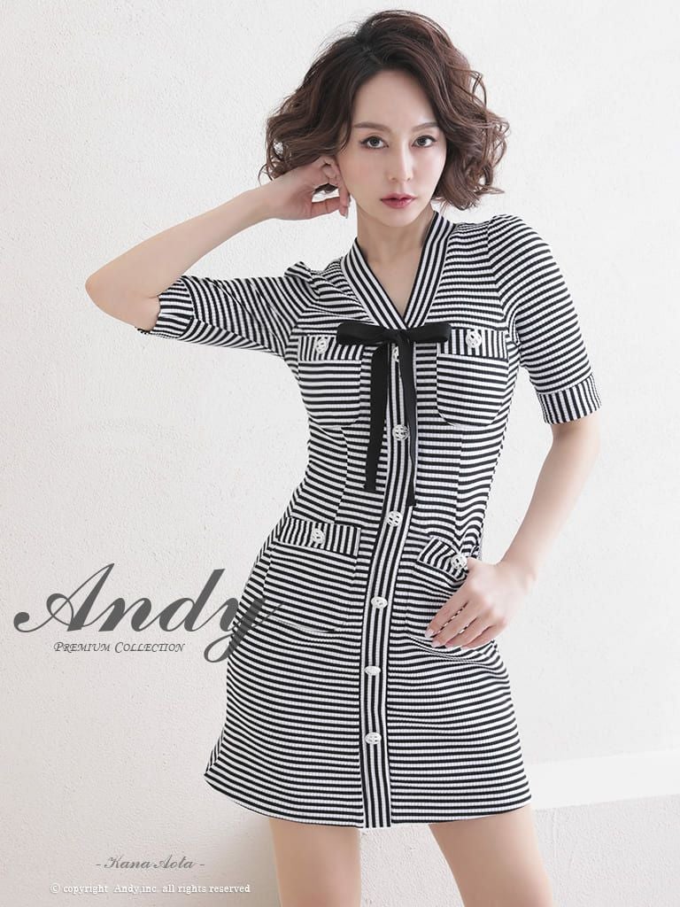 キャバドレス Andy アンディ 高級ボーダーデザインボタン&リボン半袖タイトミニドレス