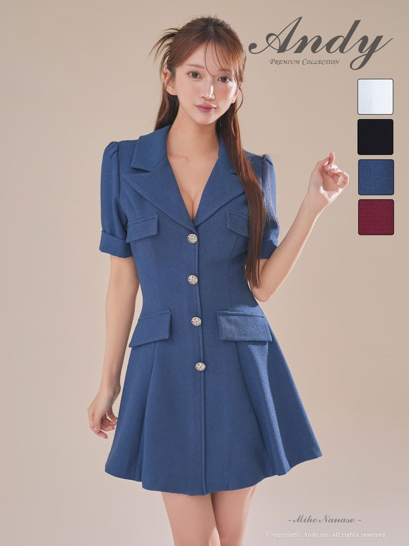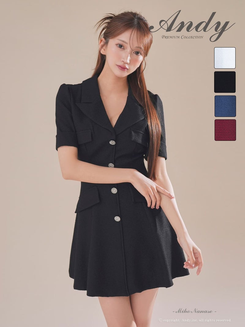 ジャケット風のしっかりしたデザイン♡ [Andy/アンディ] 高級 半袖 フレアミニドレス 襟付き ワンカラー バストカット