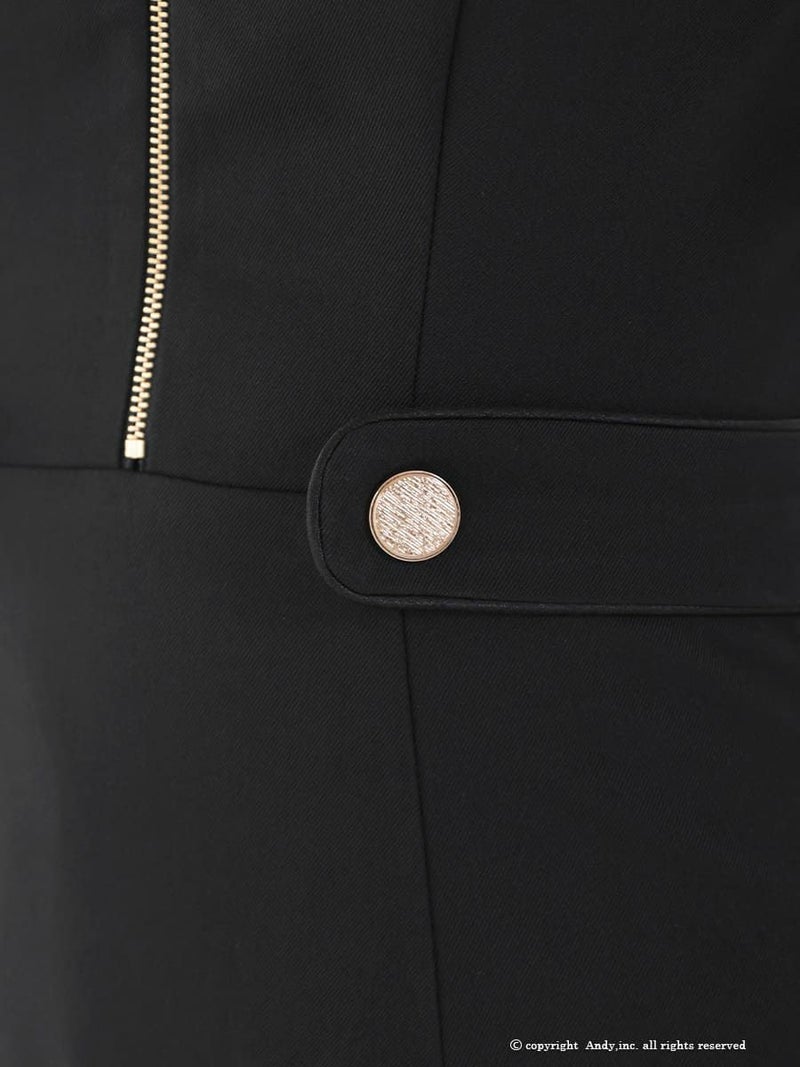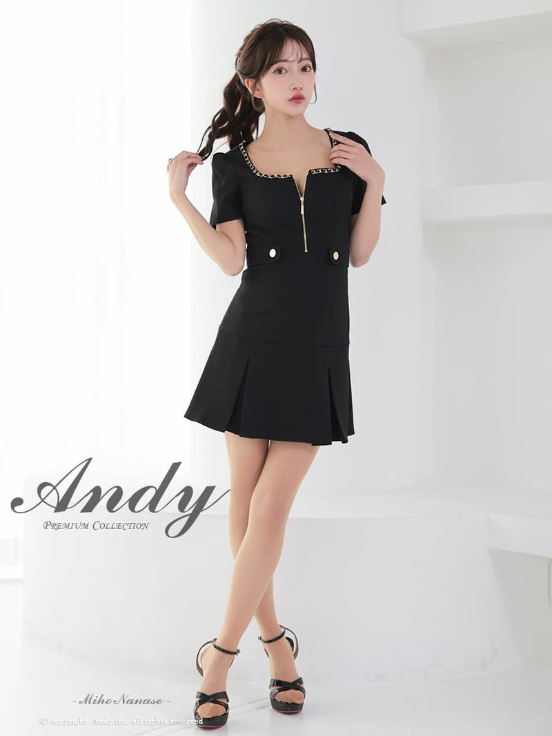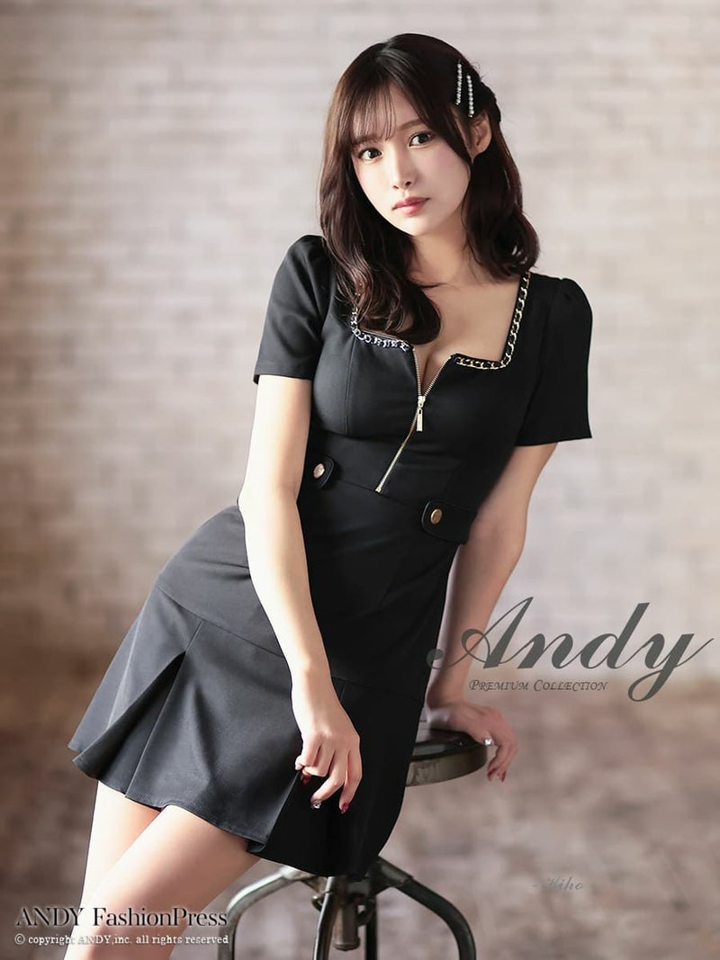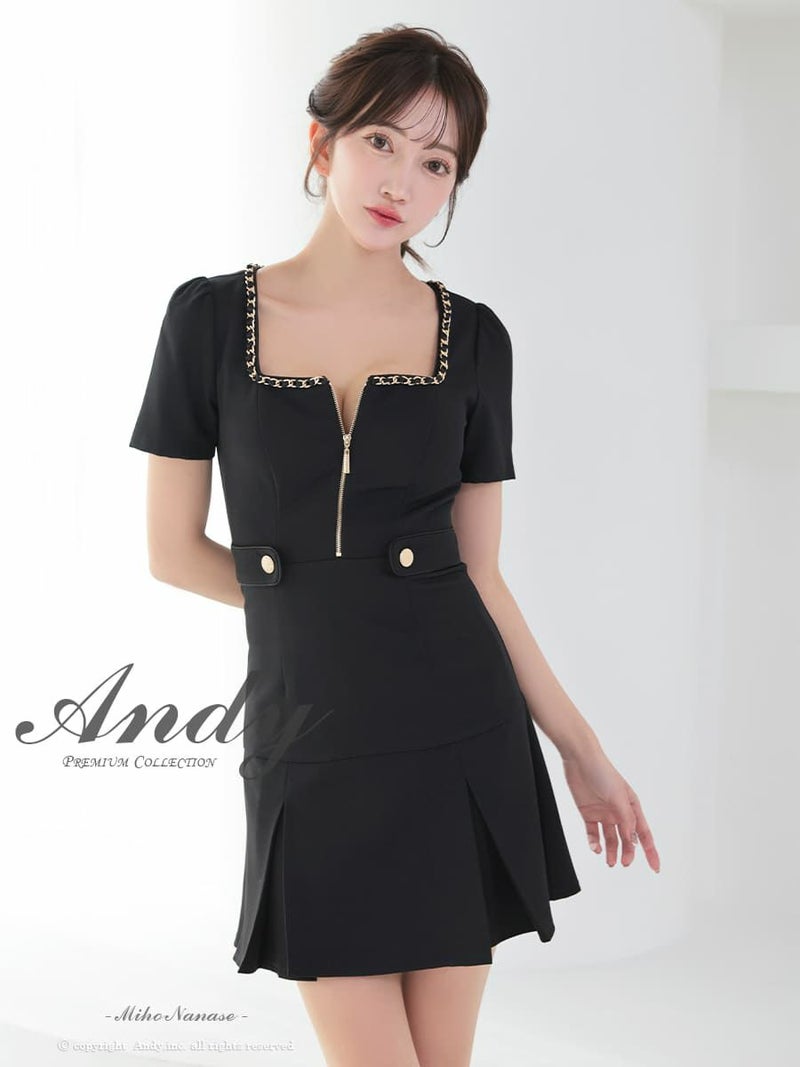キャバドレス Andy アンディ 半袖 ワンカラー スクエアネック ジップデザイン ボタン ゴールドチェーン フレア ミニドレス