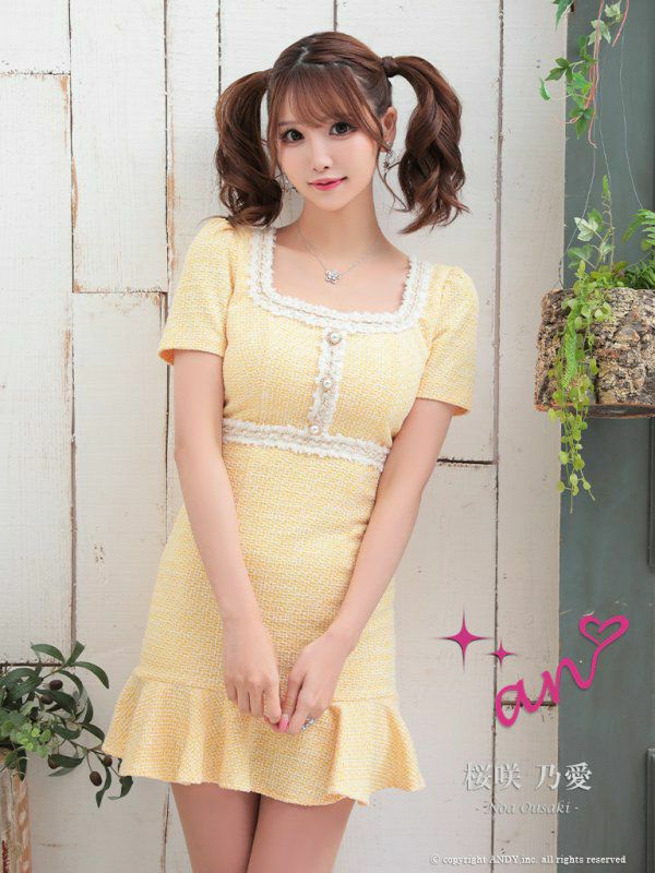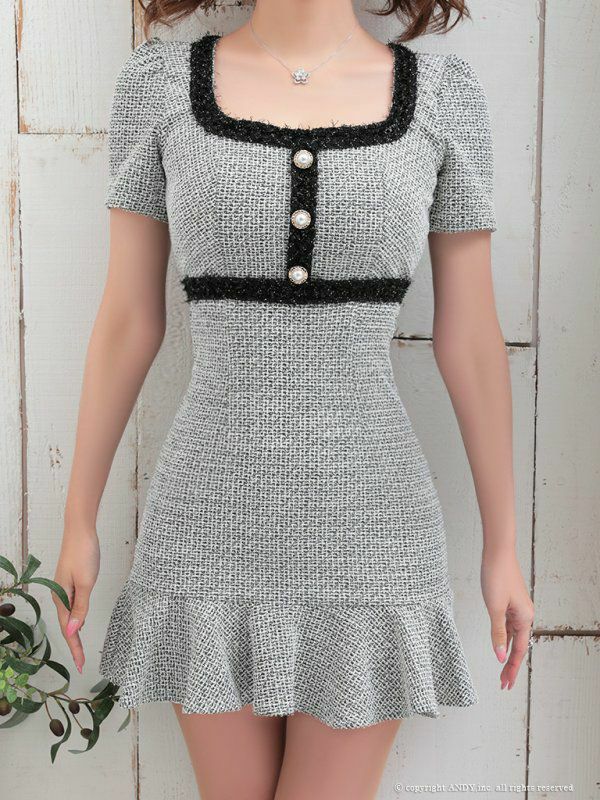 キャバドレス an アン 高級スクエアネックバイカラーデザインツイード半袖タイトミニワンピースドレス