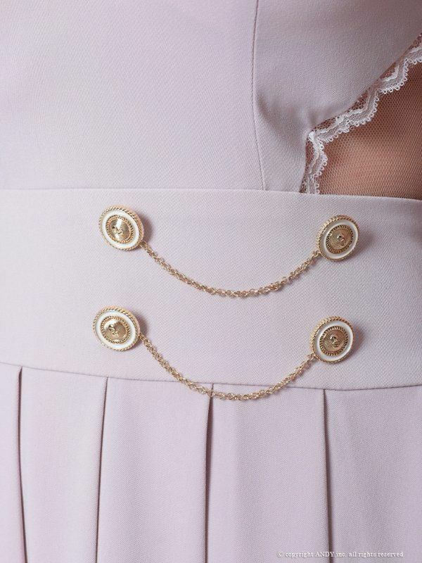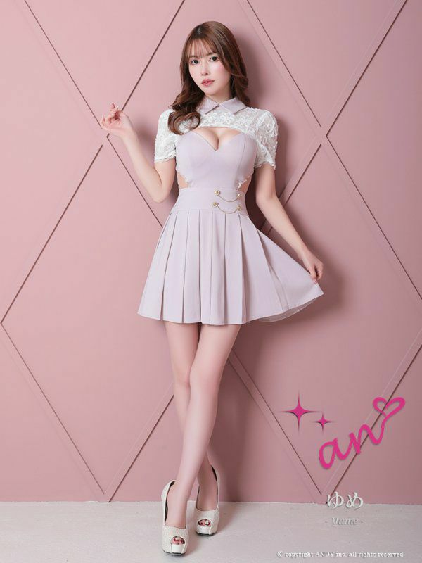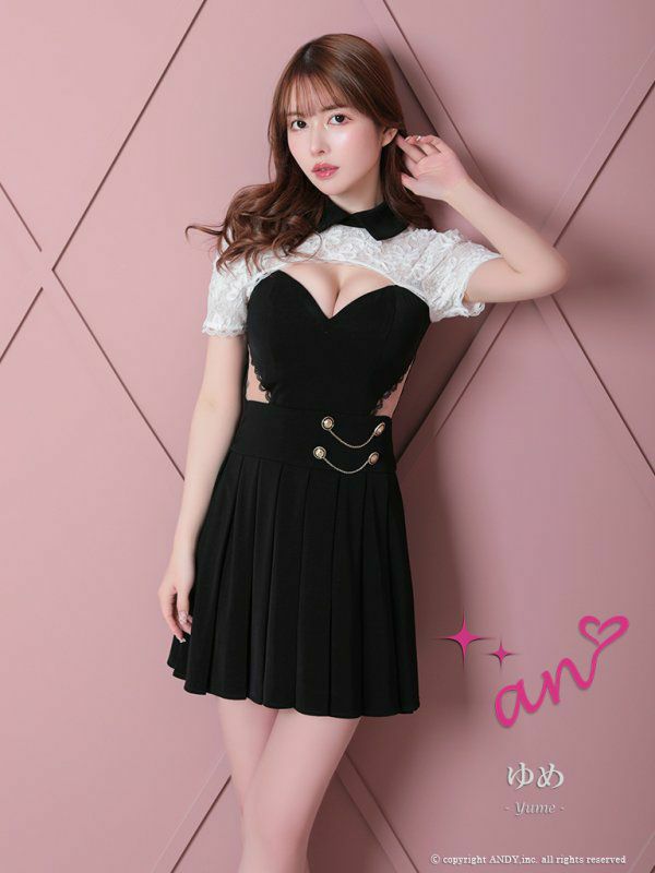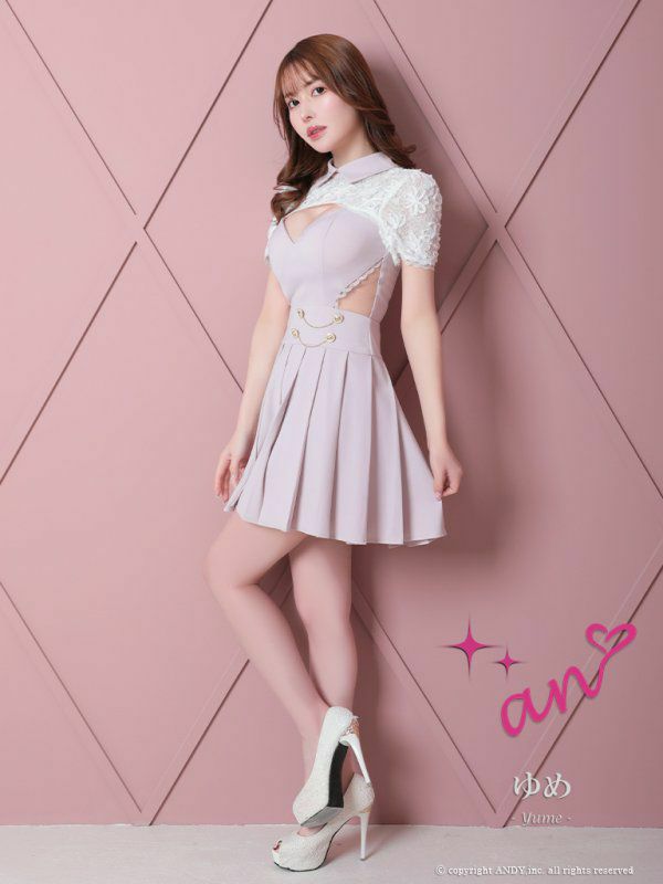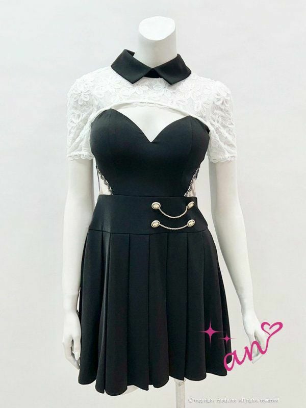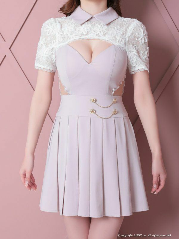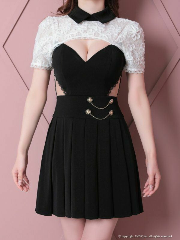 大胆なバストカットで視線を集める☆ [an/アン] 高級 襟付き フラワーレース バストカット くびれ プリーツ 半袖 谷間魅せ フレアミニドレス