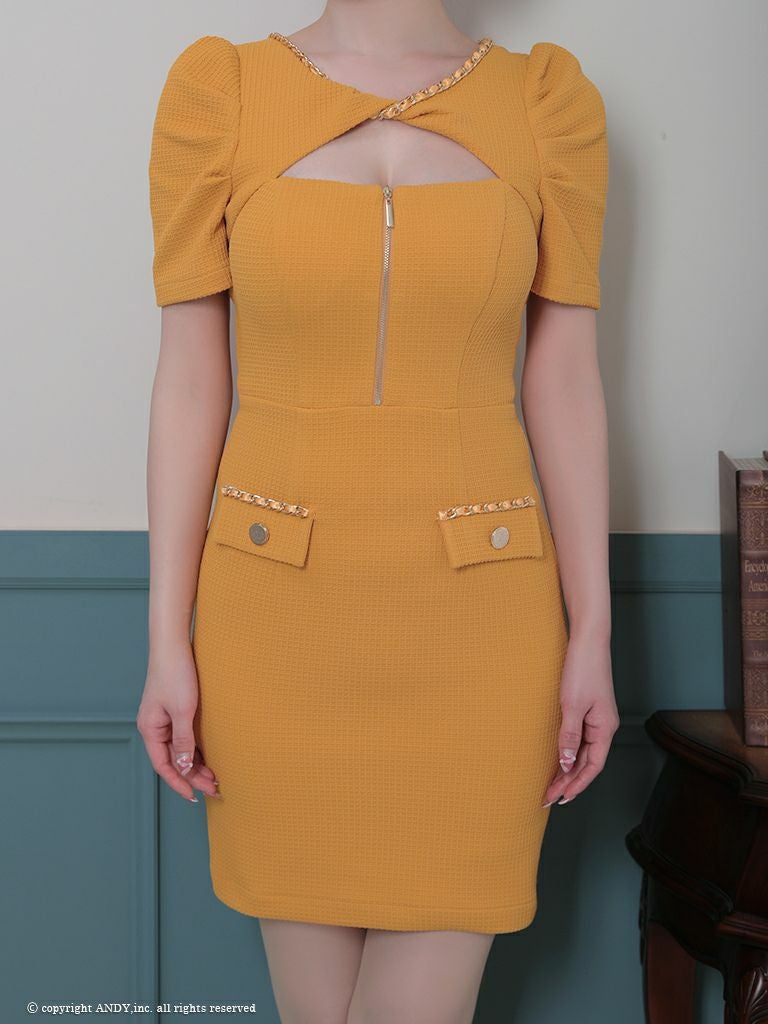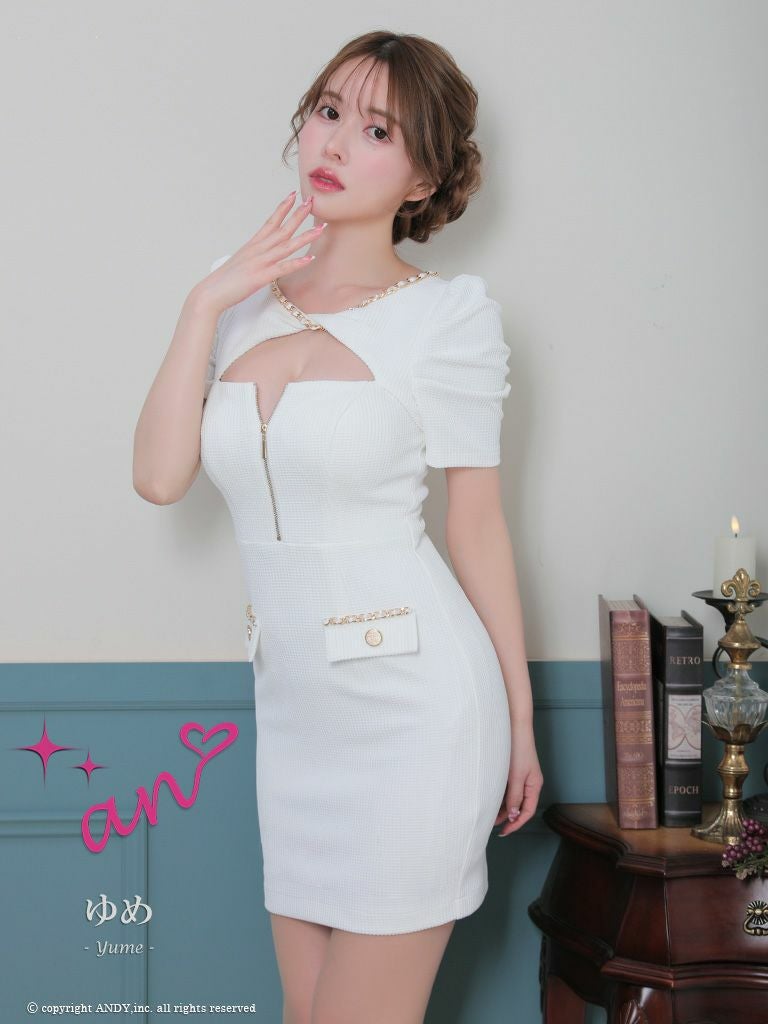 4. [an/アン] 高級 半袖 ギャザー バストカット ジップ ポケットチェーン 谷間魅せ タイトミニドレス