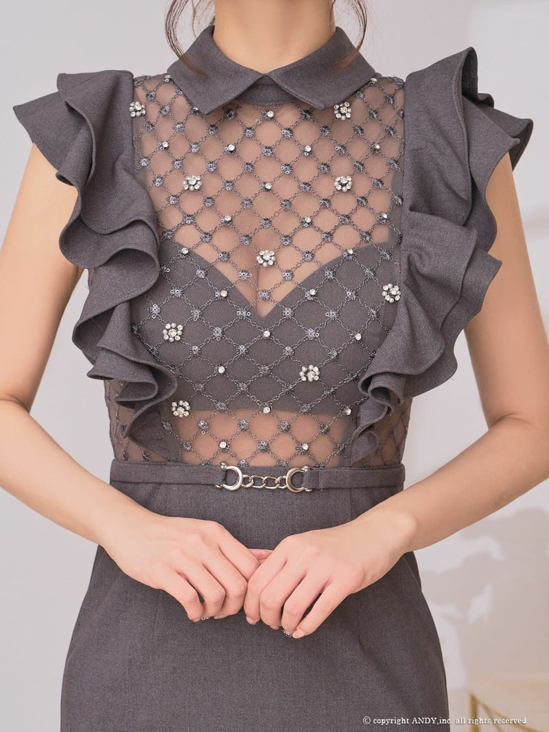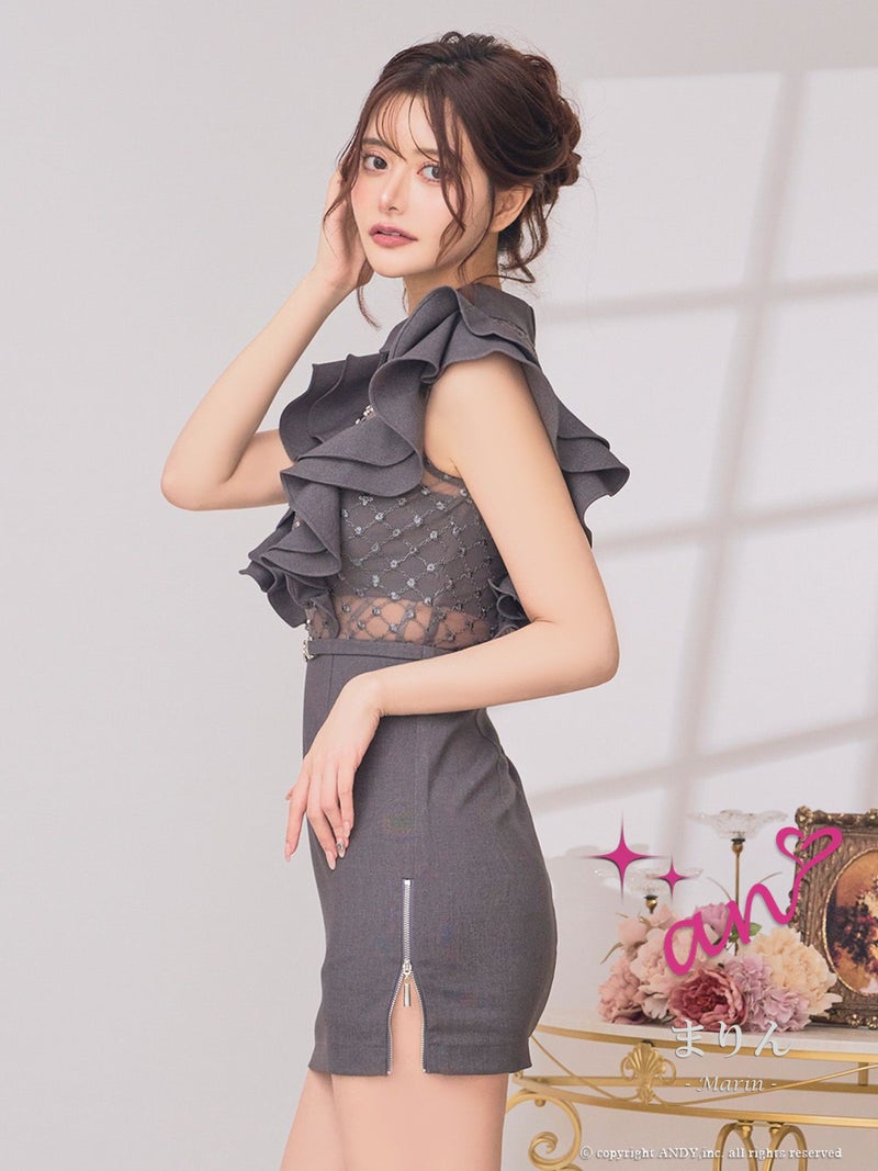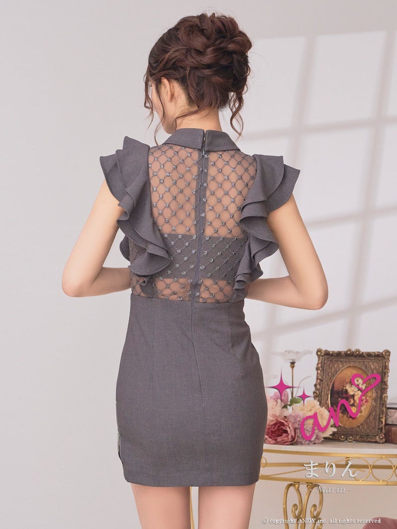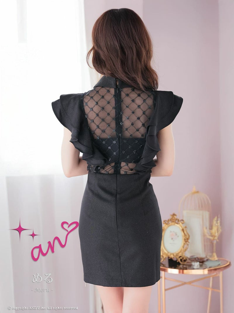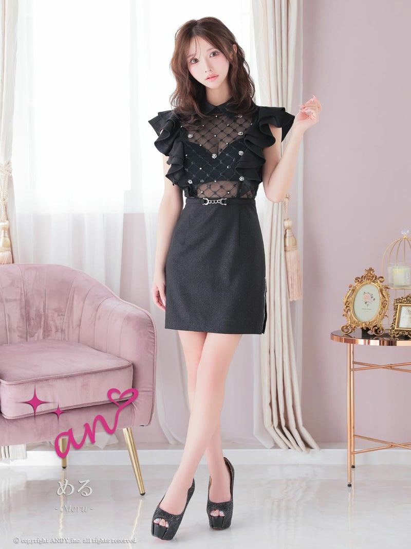 [an/アン] 高級 タイト ミニドレス ノースリーブ ウエストベルト 襟付き ジップ 袖フリル ビジュー