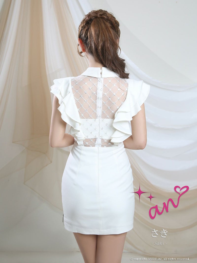 4. [an/アン] 高級 タイト ミニドレス ノースリーブ ウエストベルト 襟付き 袖フリル ビジュー