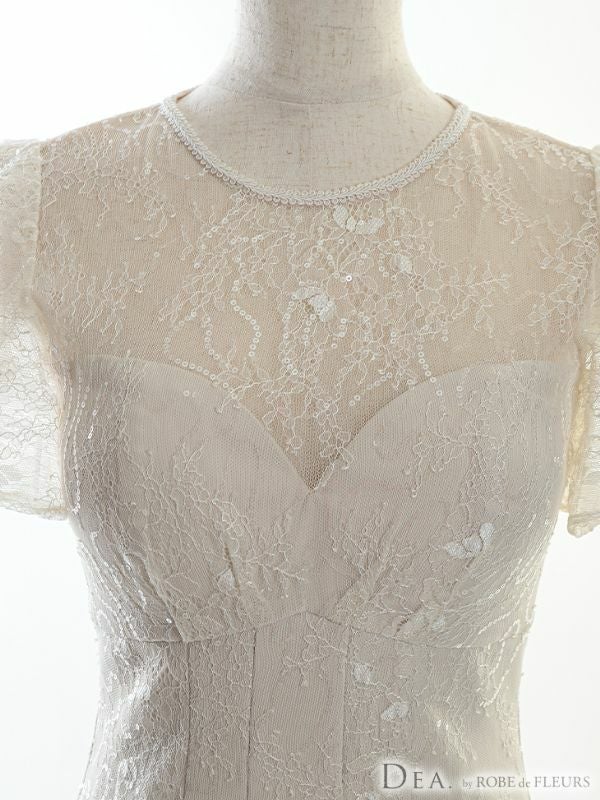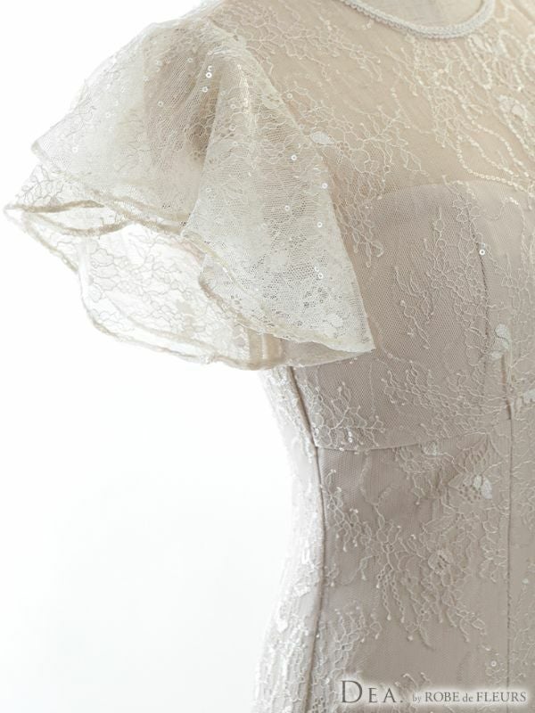 4. [DEA.byROBEdeFLEURS/ディアバイローブドフルール] 高級フリル半袖マーメードスカートスパンコール付きレース膝丈ドレス