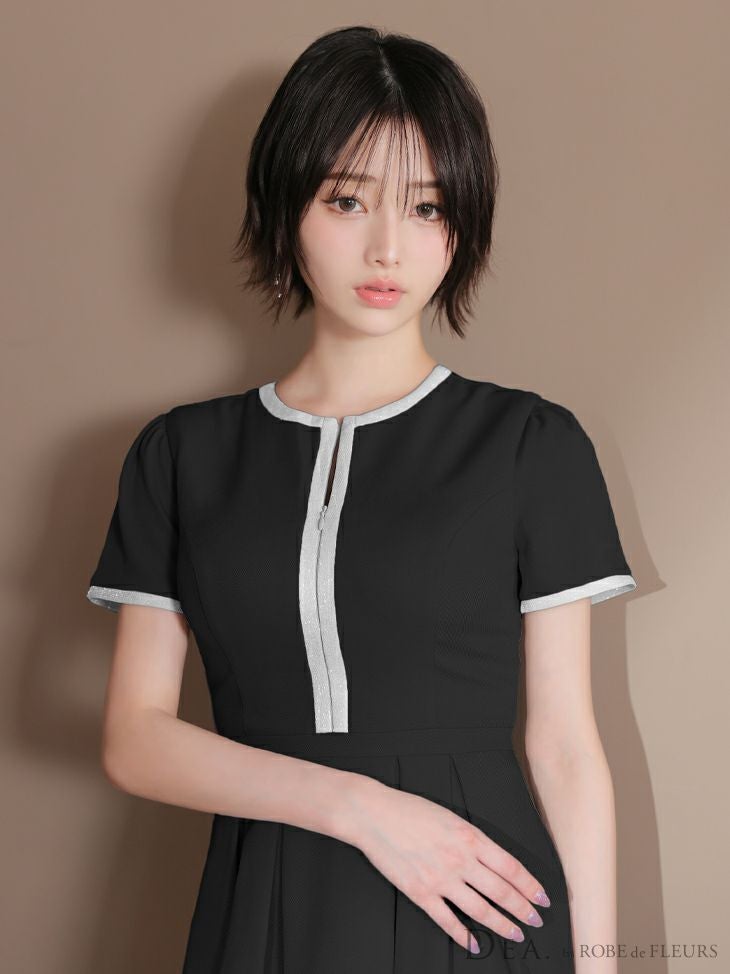 4. [DEA.byROBEdeFLEURS/ディアバイローブドフルール] 高級 半袖 バイカラー ジップ ラメツイル シンプル フレアミニドレス