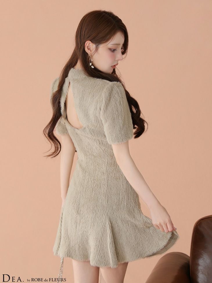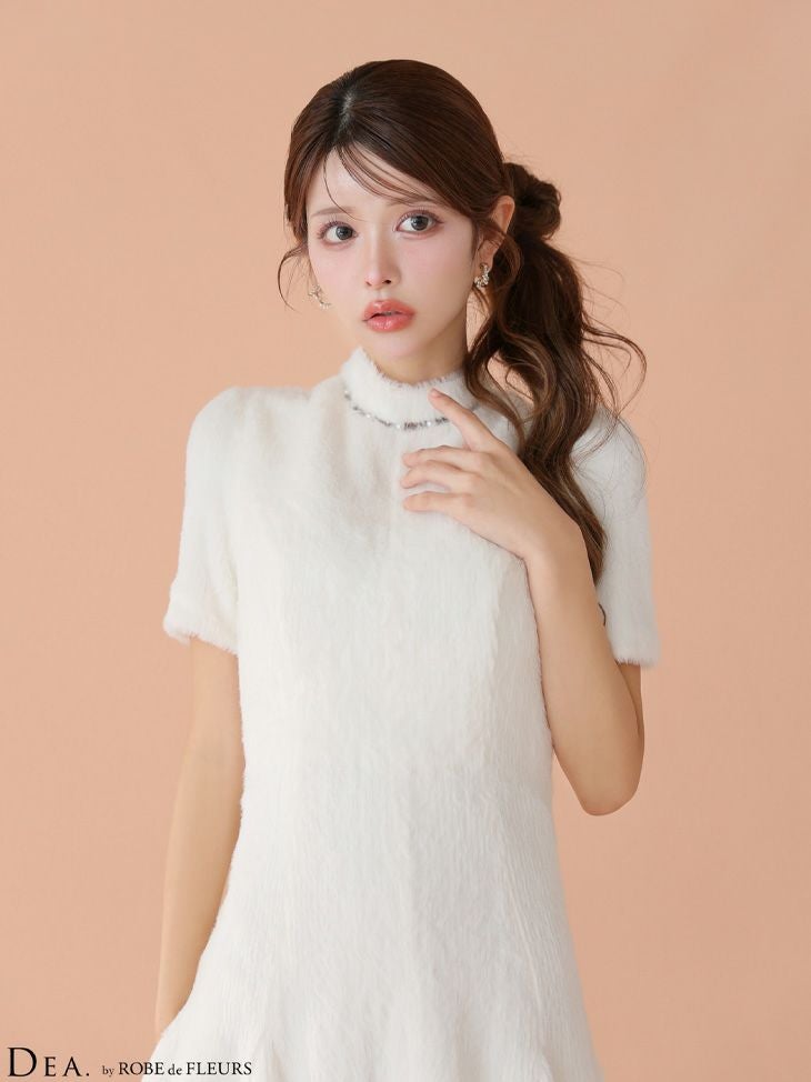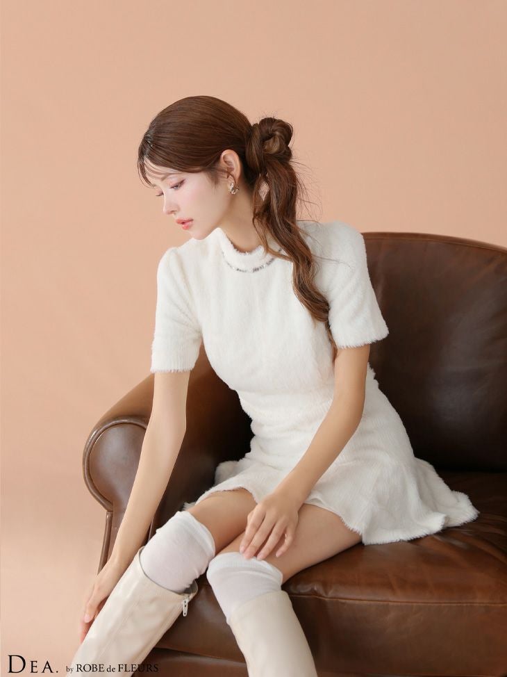 4. [DEA.byROBEdeFLEURS/ディアバイローブドフルール] 高級 ブランド Aラインミニドレス 半袖 背中魅せ ハイネック 胸元カバー ビジュー ニット