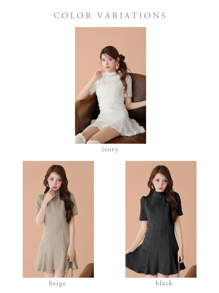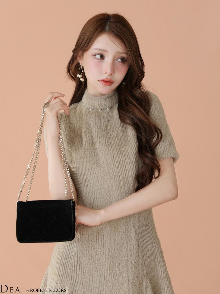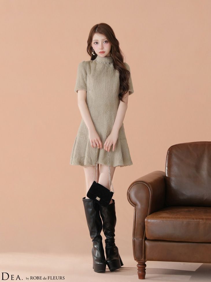 クラシカルなムードを醸し出す♡ [DEA.byROBEdeFLEURS/ディアバイローブドフルール] 高級 ブランド Aラインミニドレス 半袖 背中魅せ ハイネック 胸元カバー ビジュー ニット