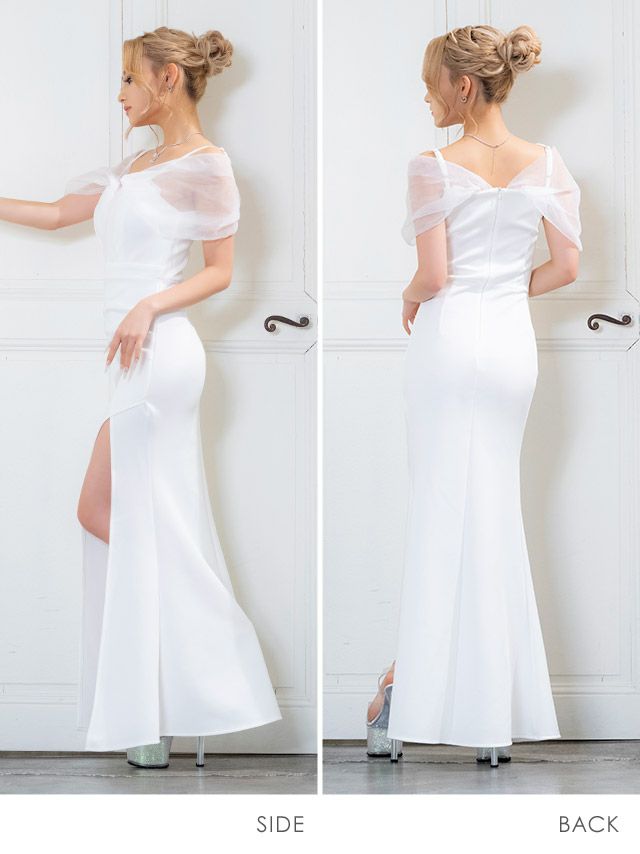 肩あきシアースリーブワンカラーストレッチスリットタイトロングドレスのサイドバッグ全身
