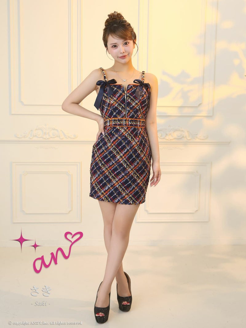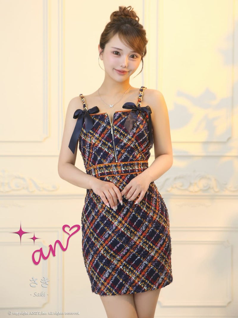 ツイードチェック柄が可愛いミニドレス♡ [an/アン] 高級 タイト ミニドレス 長袖 谷間 キャミソール ツイード ジップ リボン チェーン チェック柄