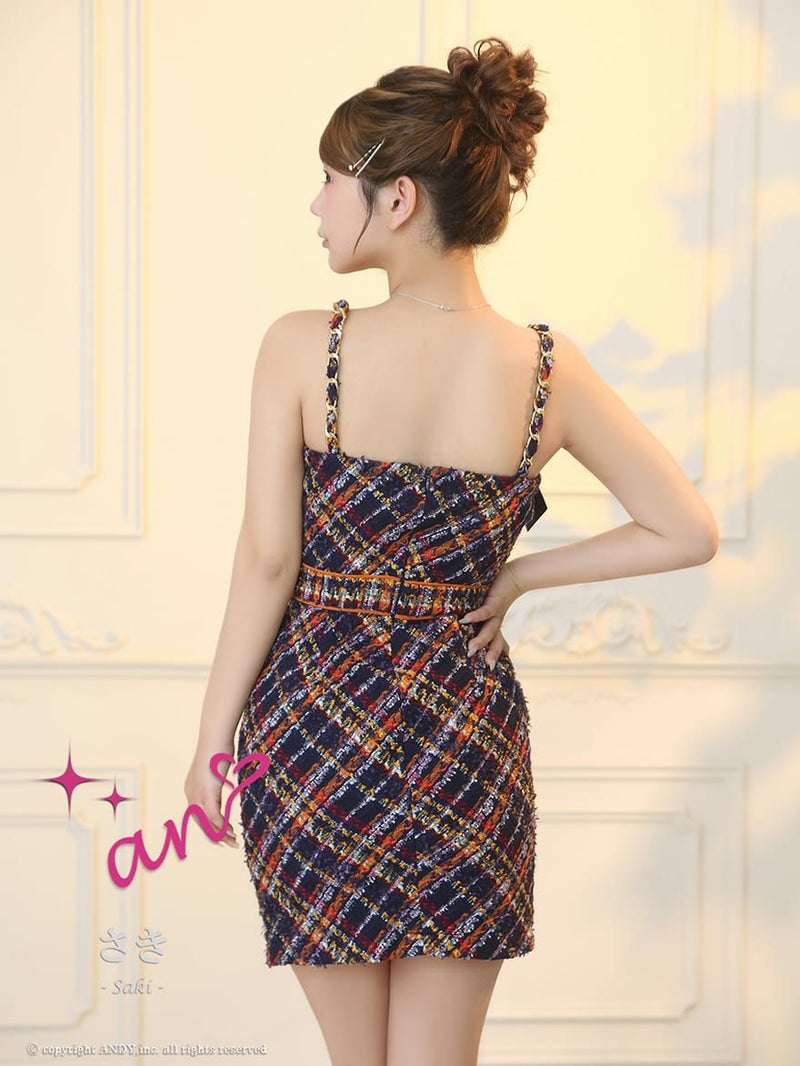 4. [an/アン] 高級 タイト ミニドレス 長袖 谷間 キャミソール ツイード ジップ リボン チェーン チェック柄