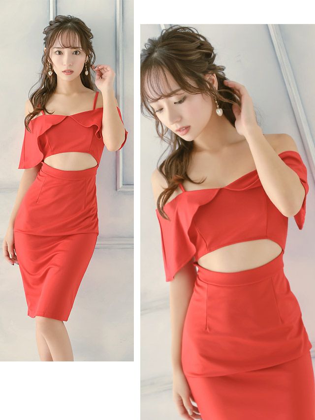 肩あきフリル袖ウエストカットアウト膝丈タイトプチプラドレスワンピースの商品詳細1