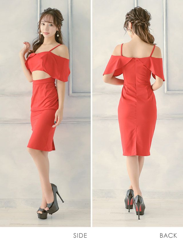 肩あきフリル袖ウエストカットアウト膝丈タイトプチプラドレス