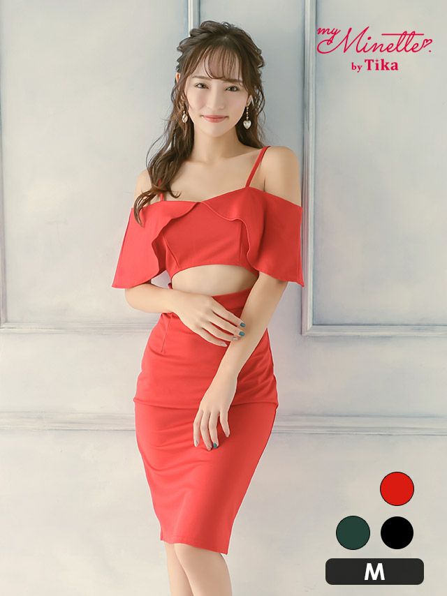 ウエストカットアウトデザイン肩あきフリル袖膝丈タイトプチプラドレスワンピースのカラーバリエーション