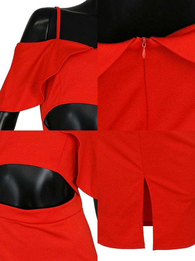 ウエストカットアウトデザイン肩あきフリル袖膝丈タイトプチプラドレスワンピースの商品特徴