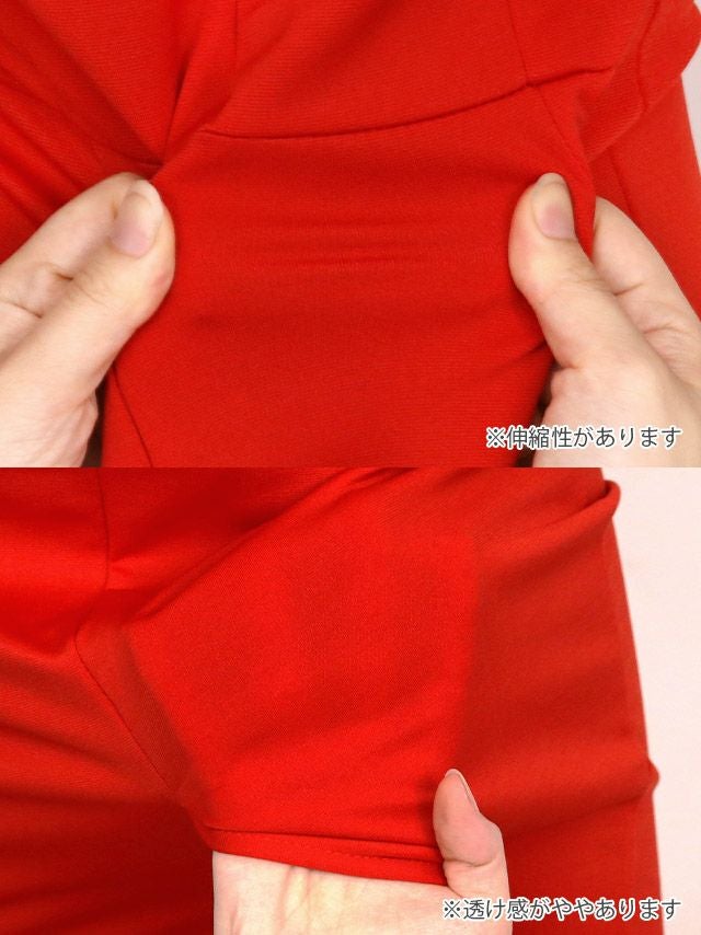 肩出し 二の腕カバー フリル袖 ウエストカット タイト膝丈ドレ (中尾みほ着用)
