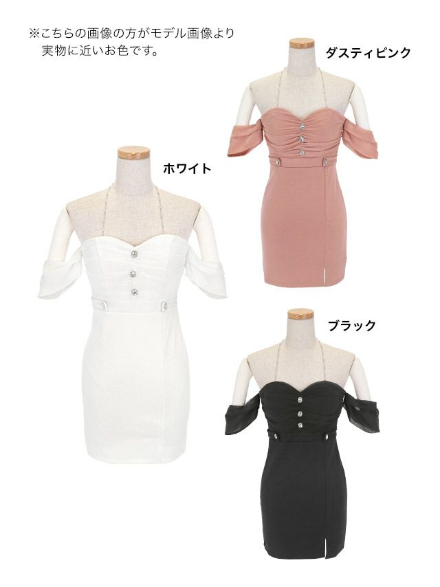 肩あき チュール オフショルダー ハートカット ビジューボタン サイドウエストベルト ストレッチ タイトミニドレスのカラーバリエーション