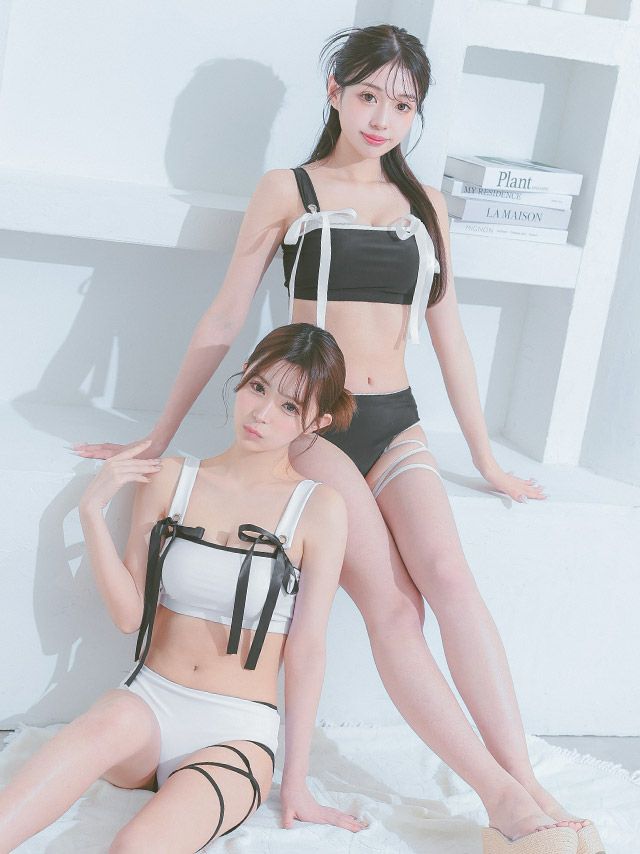 4. 水着 クロスストラップ サテンリボンパイピング ビスチェ ギャル ビキニ (ブラック/雨宮由乙花着用)
