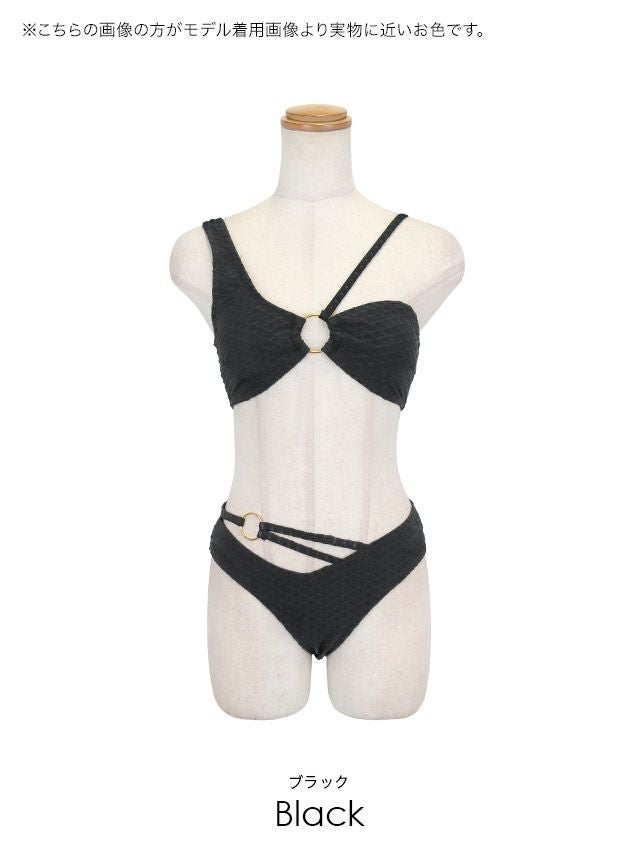5. 水着 アシメショルダー リング付き カットアウト バンドゥ ワンカラー ワッフル ギャル ビキニ (ブラック/若林萌々着用)