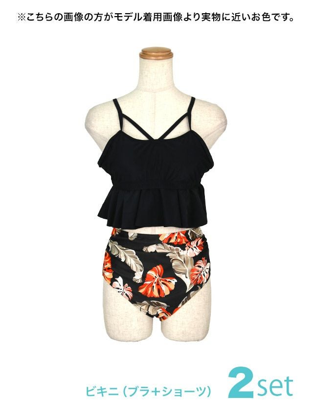南国ムード全開の映え水着♪ 水着 ストリングフリルビスチェ×ハワイアンリーフ柄ガーリーハイウエストタンキニ