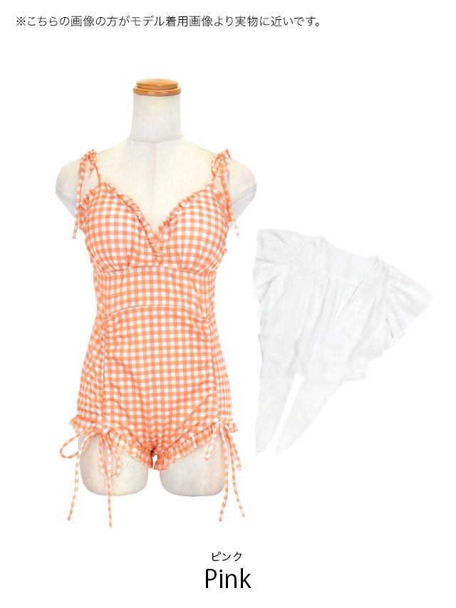ショルダーリボンフリルギンガムチェック体型カバーガーリーモノキニビキニのサイド画像
