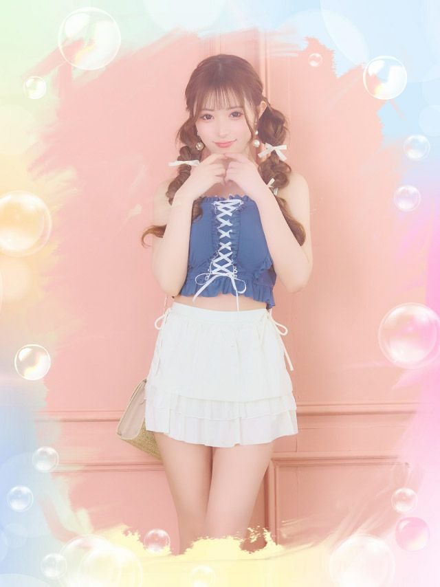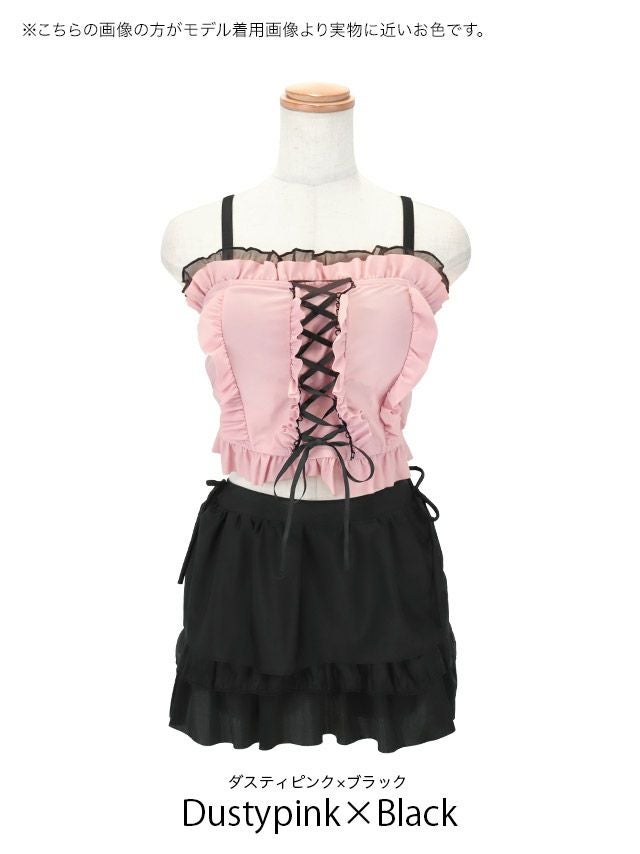 レースアップビスチェハイウエストフレアスカートガーリーフリル体型カバーラブリービキニの色展開