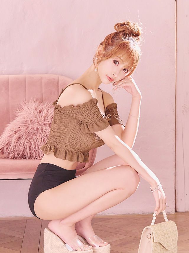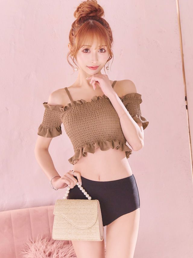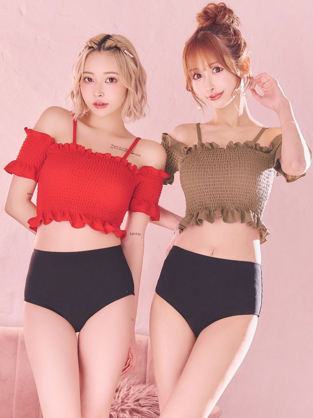 オフショルシャーリングギャザーフリルビスチェ体型カバーガーリーハイウエストビキニの色展開