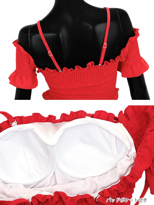 オフショルシャーリングギャザーフリルビスチェ体型カバーガーリーハイウエストビキニのフロント画像