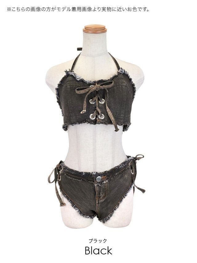 水着ストレッチデニムレースアップバンドゥビキニの詳細画像
