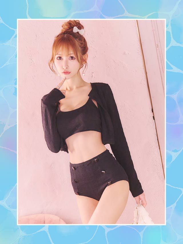 3. 水着 2wayカーディガン付きビスチェワンカラーダブルボタンハイウエスト韓国風タンキニ