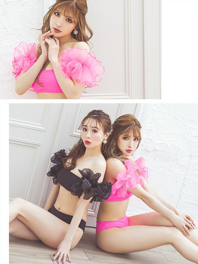 3. 水着 ボリュームチュールスリーブ付きガーリーオフショルバンドゥハイウエストビキニ