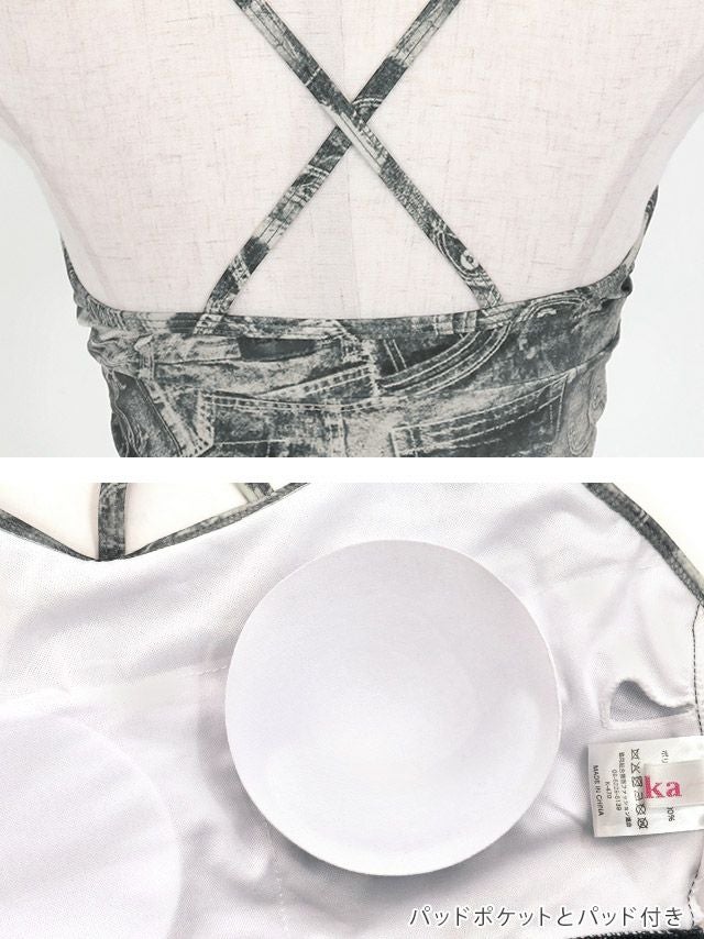 水着 2way タンキニ バンドゥ レースアップ デニムプリント 体型カバー ギャル ビキニ