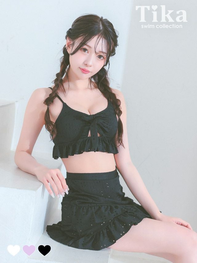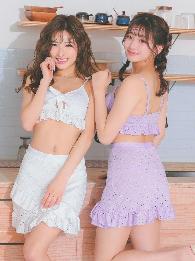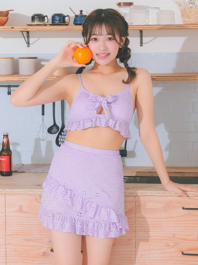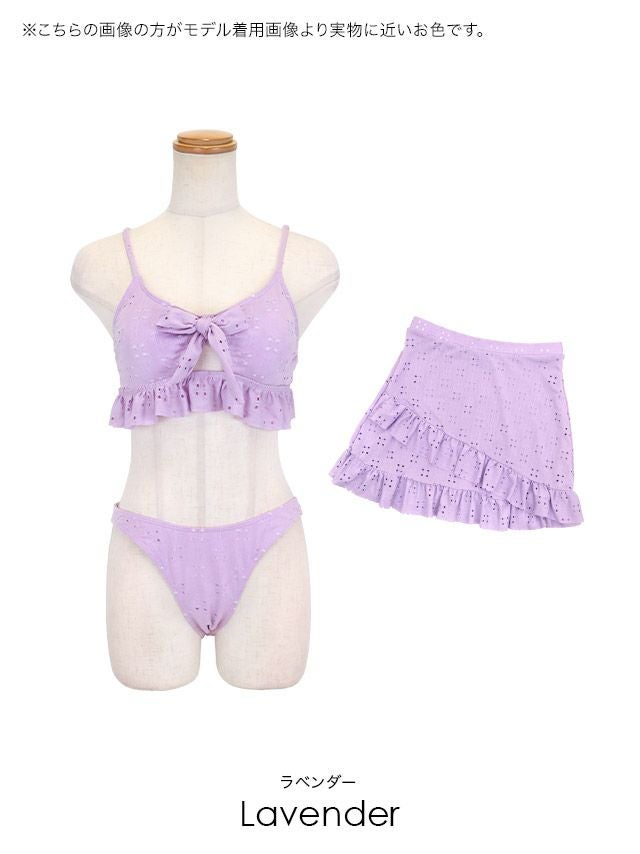 3. 水着 エンブロイダリー レース カットアウト リボン ビスチェ 体型カバー フリル ラップスカート 韓国風 ガーリー タンキニ (ホワイト/MIYABI) (ラベンダー/上ノ堀結愛)