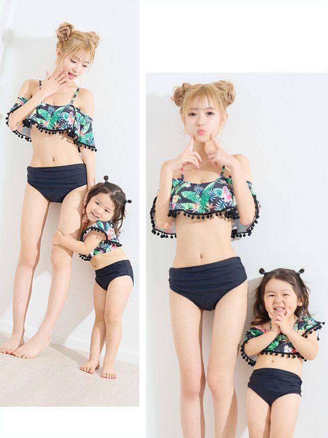 ポンポン付きオフショルフリルボタニカル柄ハイウエストビキニのセット内容