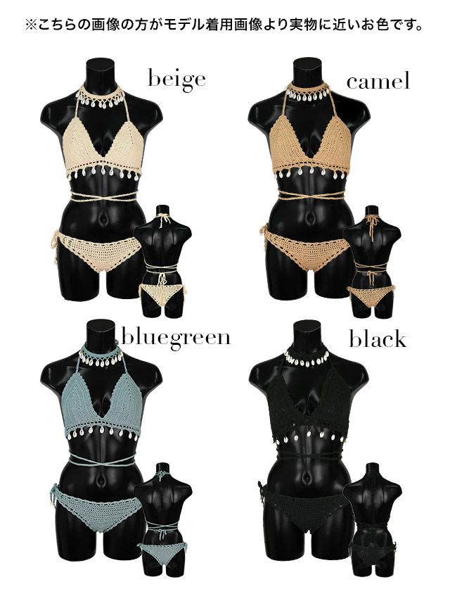 シェルチャームネックアクセ付きクロシェホルターネックビキニの色展開