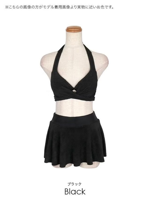 柔らかふわもこ生地で着心地◎♪ [水着] ホルターネック 体型カバー バストクロス ワッフル素材 シンプル スカートタイプ ガーリー ビキニ 黒 ブラック Lサイズあり 大きいサイズ (浦西ひかる着用) [tk-sw18224]