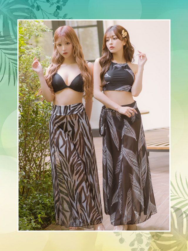 ゼブラ柄(聖菜着用) パレオ付きリーフビスチェ体型カバービキニ&ゼブラ柄パレオパンツ付き三角ギャルビキニのサイズ・スペック表 リーフ柄(れいぽよ着用) パレオ付きリーフビスチェ体型カバービキニ&ゼブラ柄パレオパンツ付き三角ギャルビキニのサイズ・スペック表
