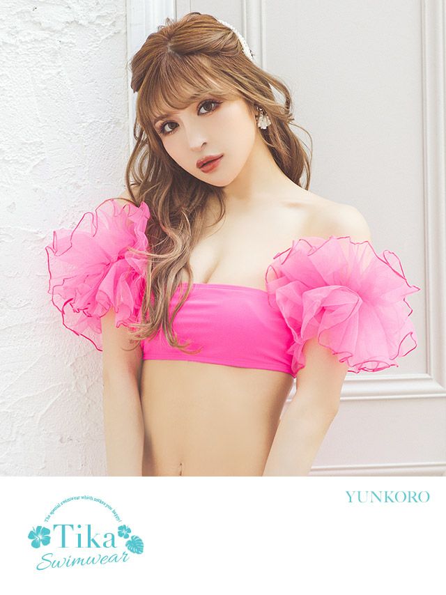 3. 水着 ボリュームチュールスリーブ付きガーリーオフショルバンドゥハイウエストビキニ