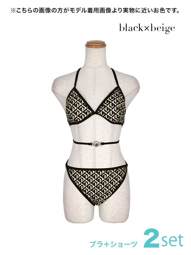モノグラム 幾何学 総柄 セクシー ウエストマーク クロス ストラップ 紐 ギャル 海外 黒 ブラック 白 ホワイト 三角ビキニのカラーバリエーション