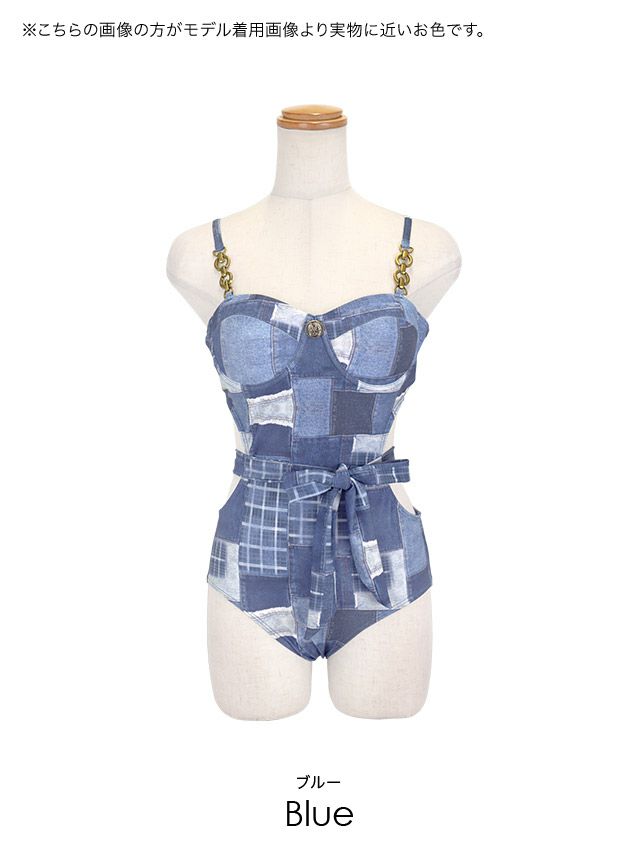 3. SALE 水着 パッチワーク ストレッチ デニム ギャル モノキニ ウエストリボン カットアウト ビキニ (ブルー/MIYABI着用)