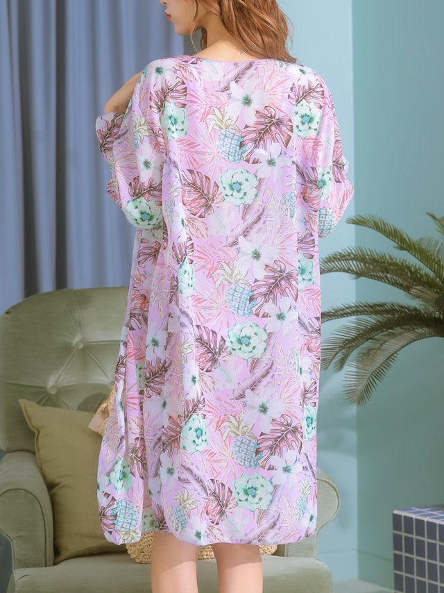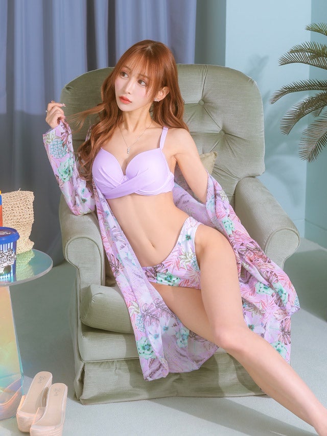 3. [SALE] 水着 3点セット ビキニ ガウン付き 花柄 ボタニカル柄 パープル 紫 クロスデザイン 体型カバー 二の腕カバー 盛れる ビーチ 海 リゾート(浦西ひかる着用) [tk-sw221a]