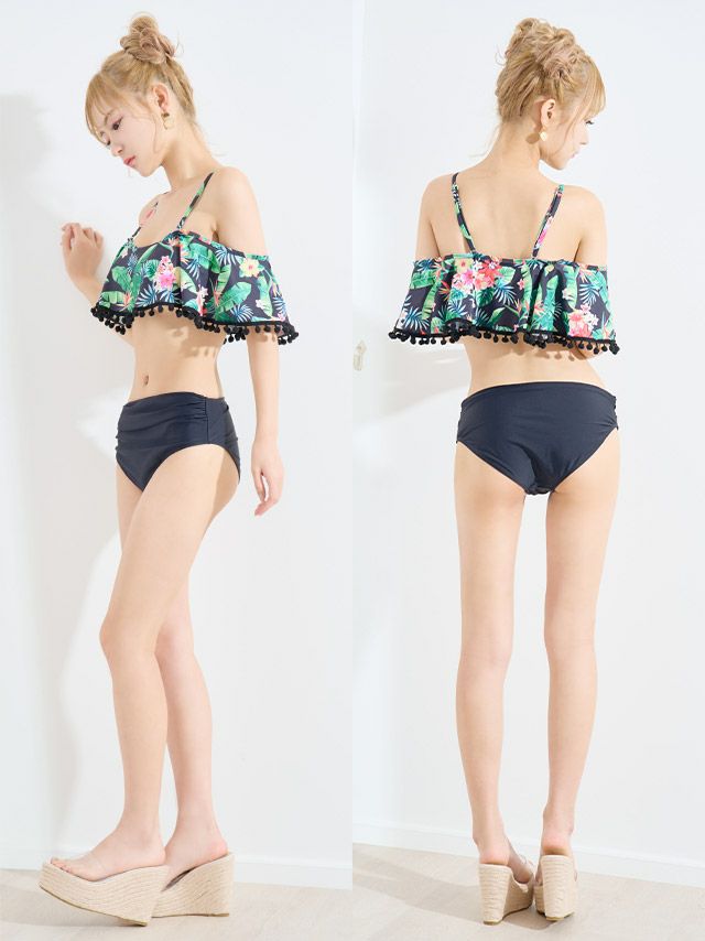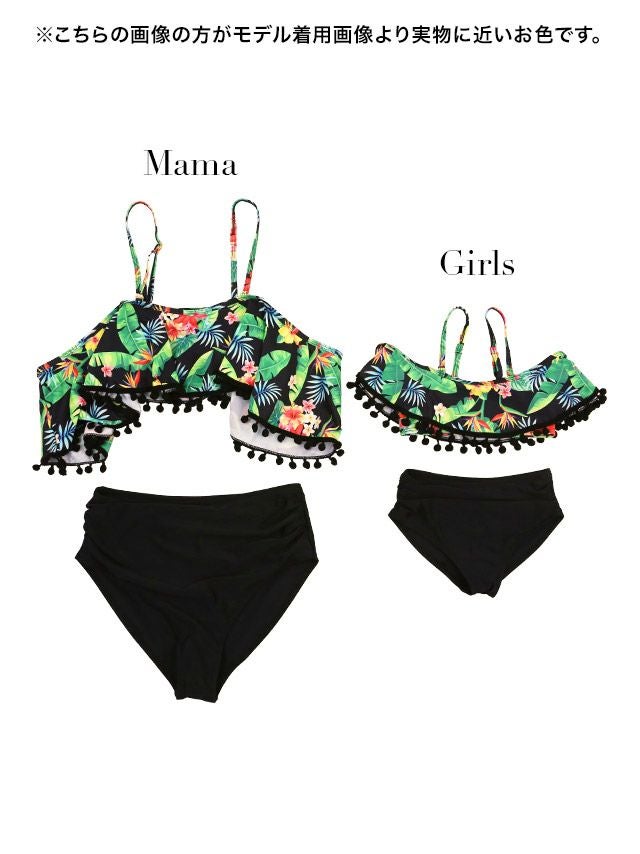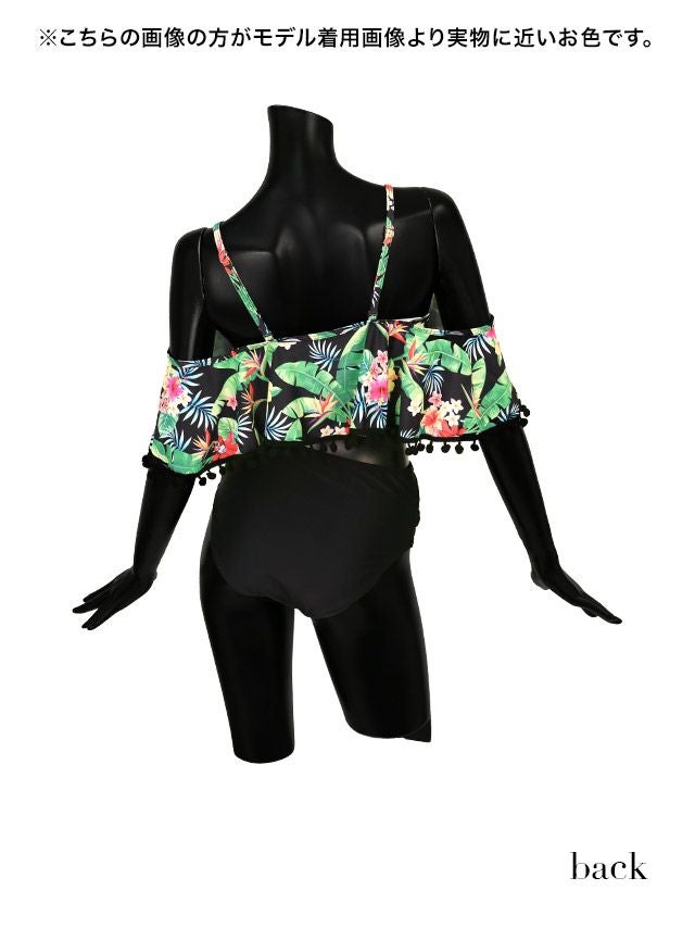 元気な印象にしてくれるボタニカル水着♪ 水着 オフショルポンポン付きボタニカルハイウエストタンキニお揃いタンキニ