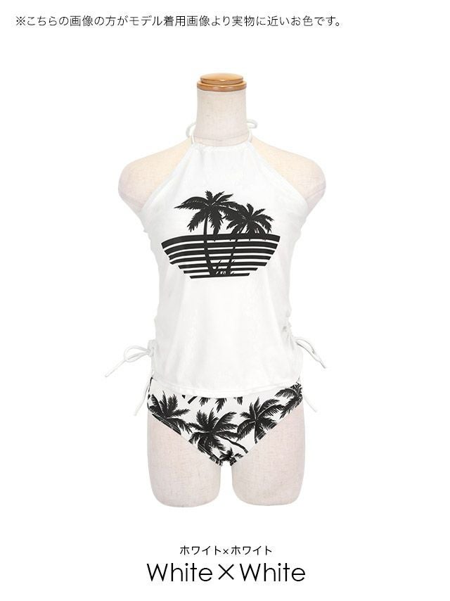 4. SALE 水着 ヤシの木 プリント アメリカンスリーブ ドロスト ビスチェ 体型カバー ギャル タンキニ (ホワイト/上ノ堀結愛着用)