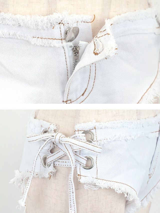 5. [水着] デニム フリンジ レースアップ ショートパンツ ハーフブラジリアン 編み上げ ホルターネック カジュアル スポーティ セクシー ギャル ビキニ 黒 ブラック 白 ホワイト (PyunA./浦西ひかる着用) [tk-sw650a]